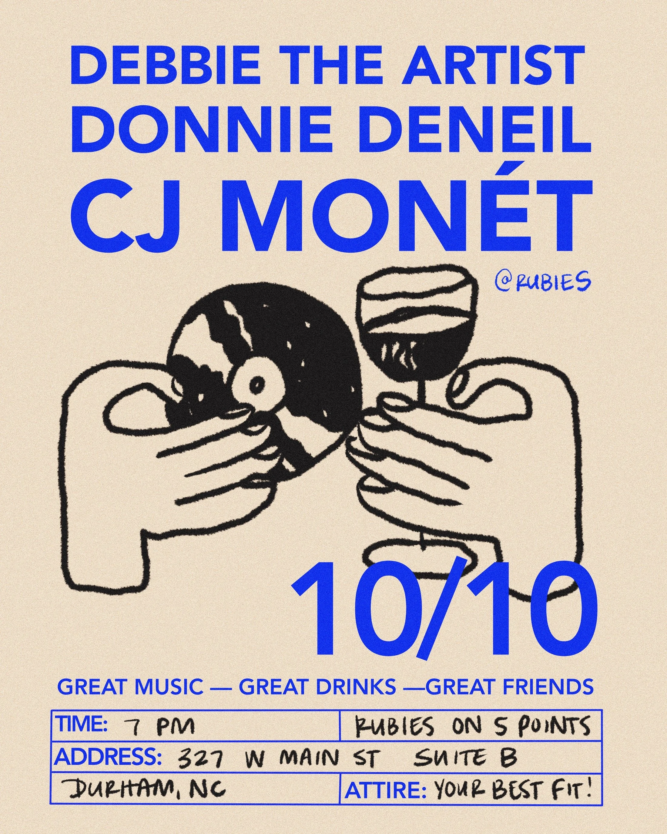 COME JOIN CJ MONÉT, DONNIE DENEILL AND DEBBIE THE ARTIST ON THIS FRIDAY, 10/10, FOR A NIGHT OF R&B, SOUL, AND LIVE INSTRUMENTATION AT RUBIES IN DURHAM, NORTH CAROLINA. CJ MIGHT EVEN BE PERFORMING SOME NEW UNRELEASED SONGS (SHHHH!)